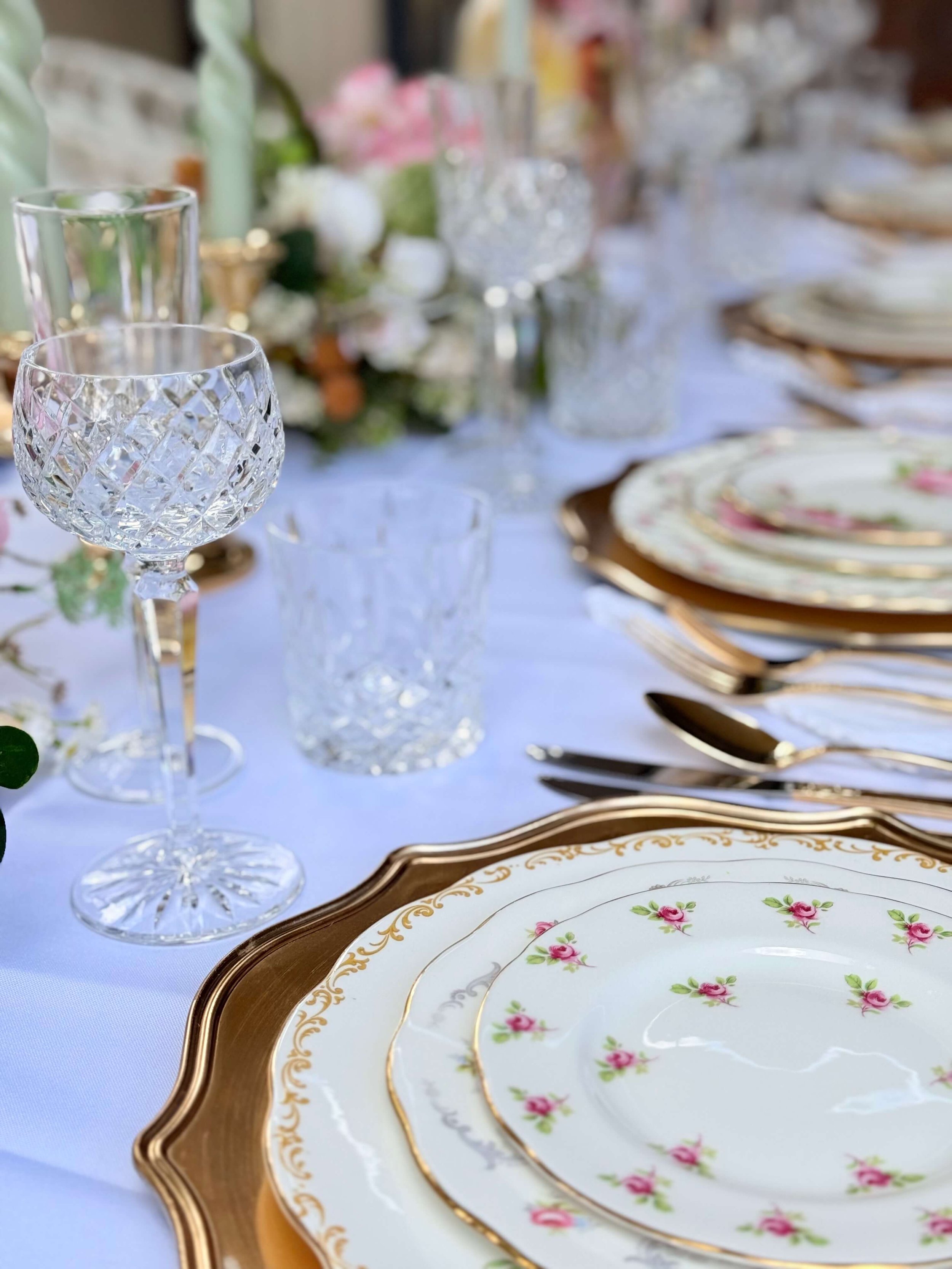 Collected over many years, our vintage tablescapes are created using decadent gold-gilded fine bone china dinner, entrée, and dessert plates. These are complemented by our glamorous vintage 24k gold-plated cutlery, crystal glassware, charger plates, and vintage linens, all of which add charm and timeless elegance to your table. With a vast selection of patterns, colours, and florals to choose from, you're sure to find the perfect plates.